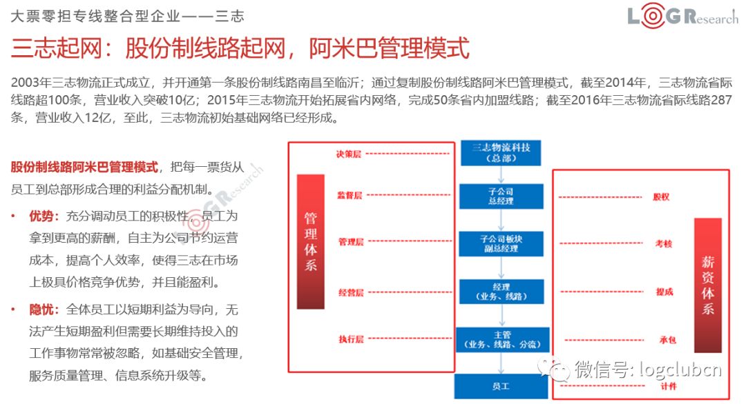 2003年,三志物流正式成立,并开通第一条股份制线路南昌至临沂;通过复制股份制线路阿米巴管理模式,截至2014年,三志物流省际线路超100条,营业收入突破10亿;2015年三志物流开始拓展省内网络,完成50条省内加盟线路;截至2016年三志物流省际线路287条,营业收入12亿,至此,三志物流初始基础网络已经形成。