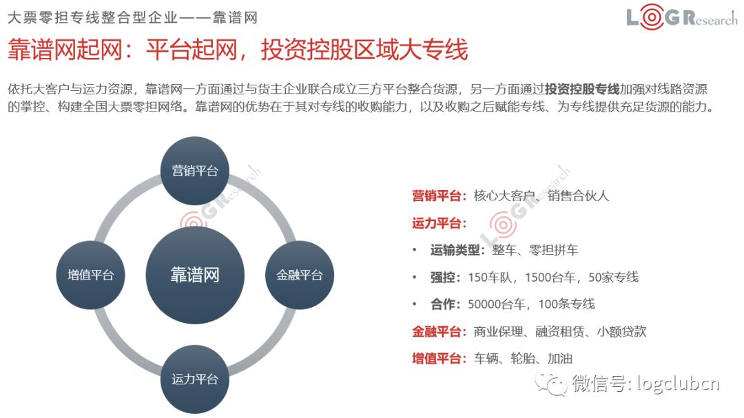 靠谱网于2013年成立,自成立之初到现在,已从模式的探索深入到了业务的实践层面。依托大客户与运力资源,靠谱网一方面通过与货主企业联合成立三方平台整合货源,另一方面通过投资控股专线加强对线路资源的掌控、构建全国大票零担网络。靠谱网的优势在于其对专线的收购能力,以及收购之后赋能专线、为专线提供充足货源的能力。
