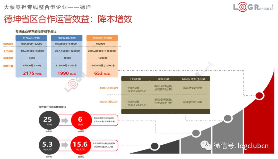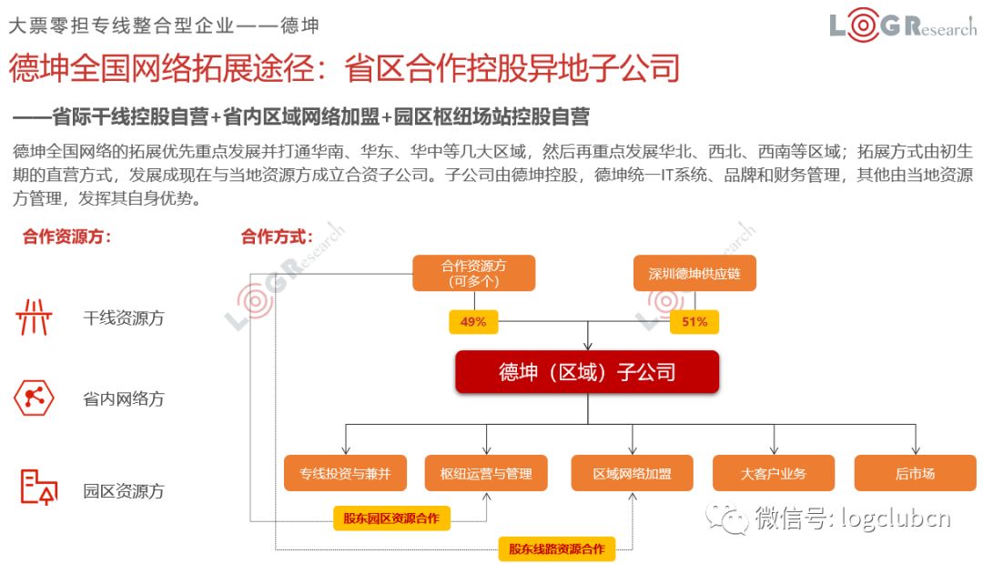 从运营深度上来说:德坤是直营专线合并重组起网,2016年4月,通过带有自身业务的9家核心专线企业合并,形成一张初步的基础物流网络;省区合作异地控股子公司拓网,子公司由德坤控股,德坤统一IT系统、品牌和财务管理,其他由当地资源方管理,发挥其自身优势。“直营+控股异地子公司”的模式确保总部强运营管控力度、高运营服务质量。