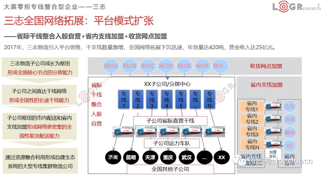 2017年,三志物流引入平台思维,干支线数量激增,全国网络拓展下沉迅速,年货量420万吨,营业收入达25亿元。