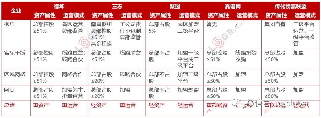 从整体上来看,我们以资产属性与运营模式进行划分,将大票零担专线整合型企业分为重资产(重线路资产/重枢纽资产)/轻资产、重运营/轻运营不同组合。